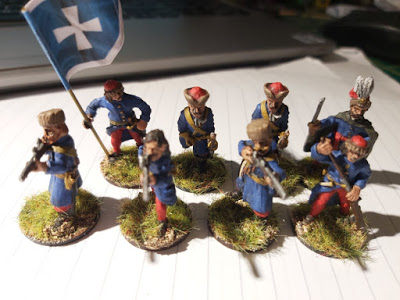 Second post of the day is a group of dismounted Polish Dragoons that have just been completed. These eight figures were added to the painting pile to bulk out a similar group of 12 figures that I had completed over the summer. You can find a link to our club website <HERE> to see further details of this earlier group...